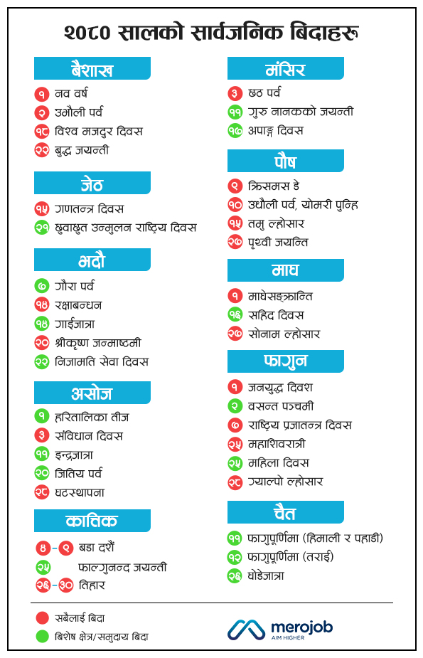 २०८० सालमा ३५ दिन सार्वजनिक बिदा हुने भएको छ । गृह मन्त्रालयले नेपाल राजपत्रमा सूचना प्रकाशित गर्दै २०८० सालको बैशाखदेखि चैतसम्म हुने सार्वजनिक बिदाहरुको सूची बनाएको हो ।