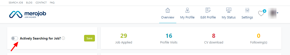 On the left corner of the dashboard, you will find the Actively Searching for Job toggle