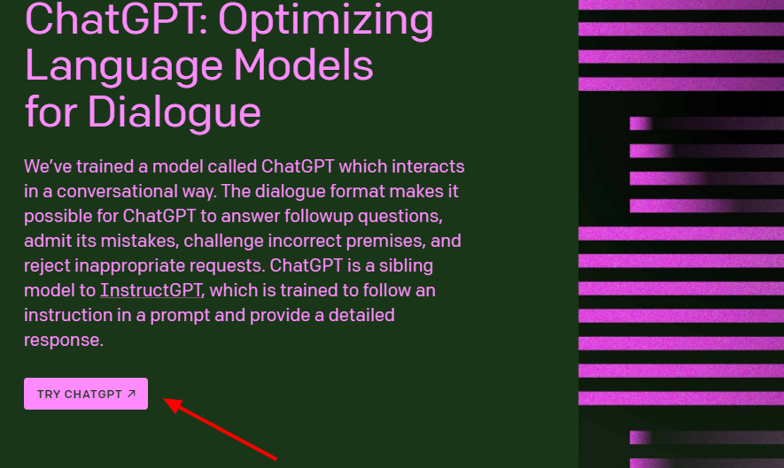 Go to the OpenAI website (https://openai.com/) and click on the "TRY CHATGPT" button at the bottom left corner.