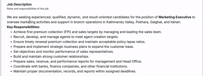 Keep your Merojob profile 100% updated as because a completed full detail profile are more likely to be noticed by the recruiters. Remember to always read a job description thoroughly and cater your application accordingly.