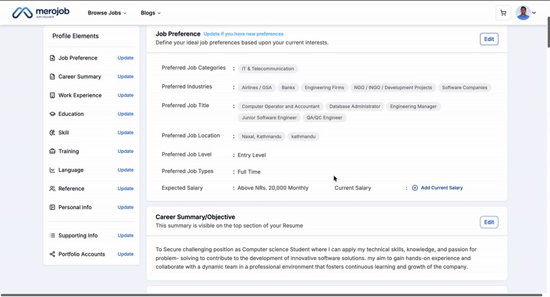 A well-optimized Merojob profile helps employers understand your potential at a glance.
