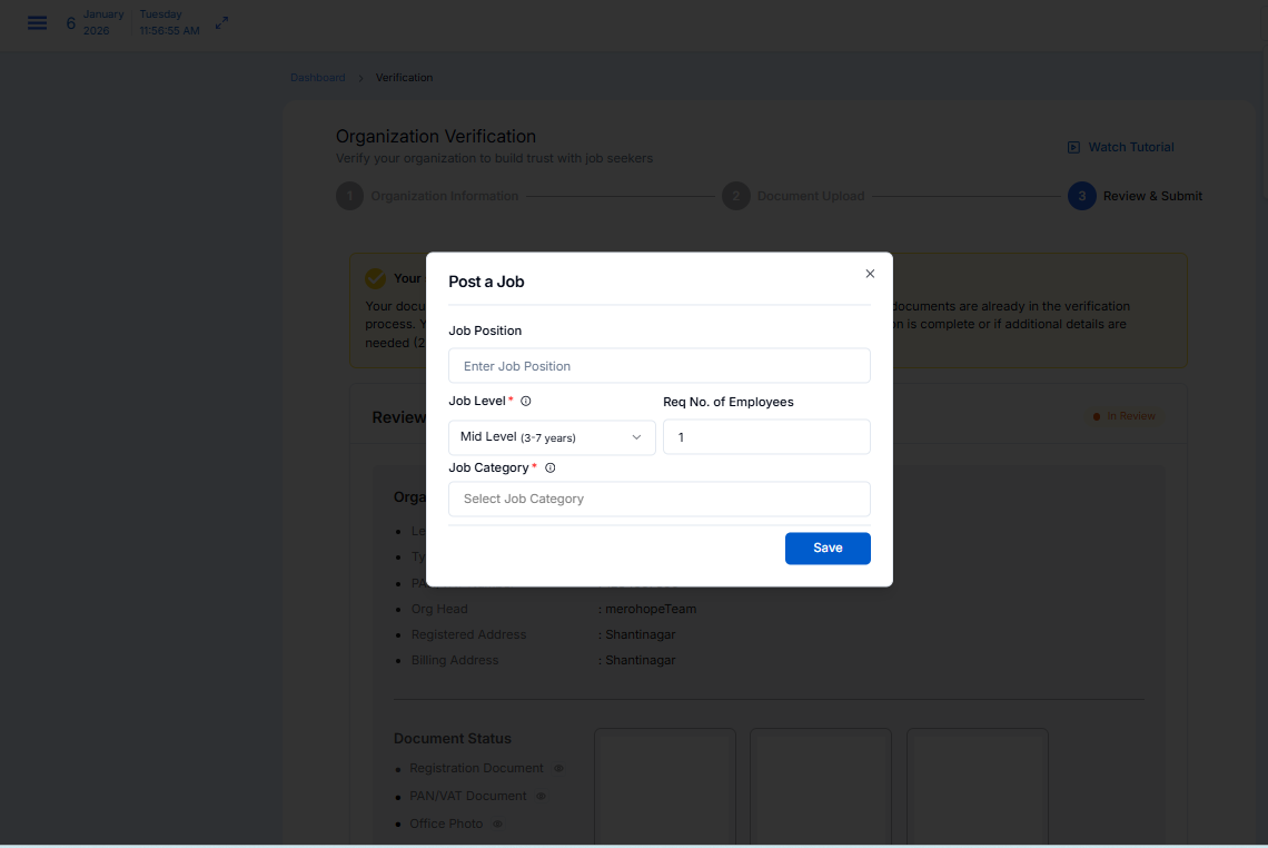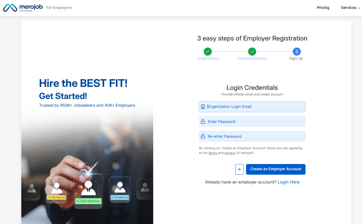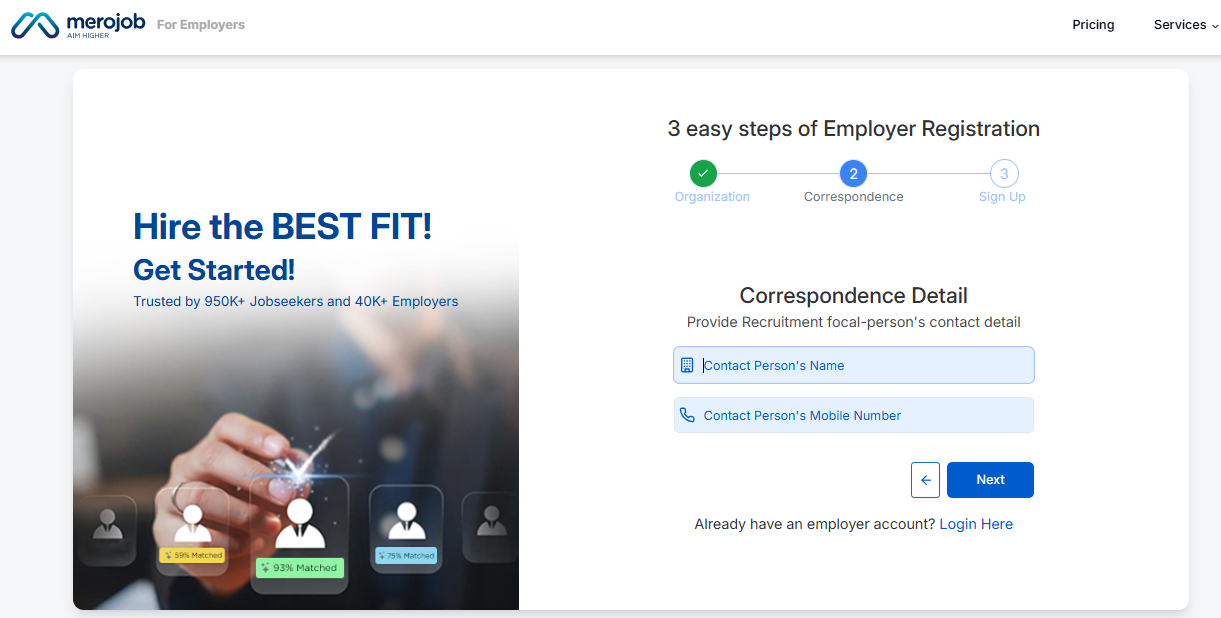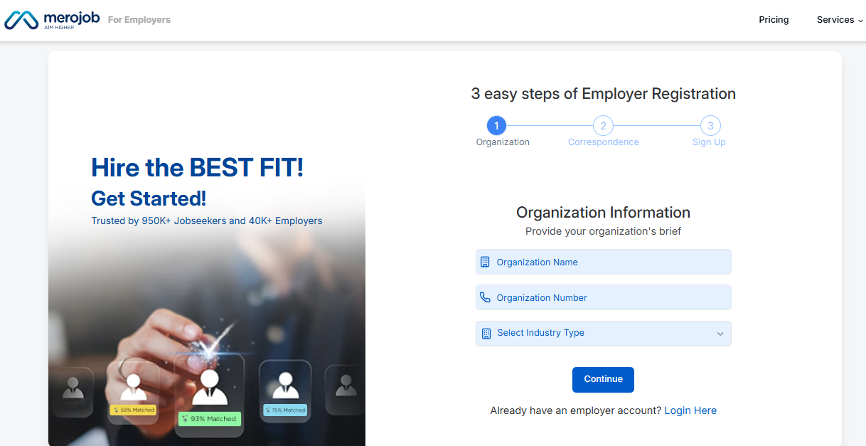 Registering as an Employer on merojob is an effective and reliable way to simplify your hiring process and connect with the best talent across Nepal. From employer registration and company profile completion to organization verification, job posting, Merojob provides a comprehensive recruitment solution designed to meet the needs of modern employers.