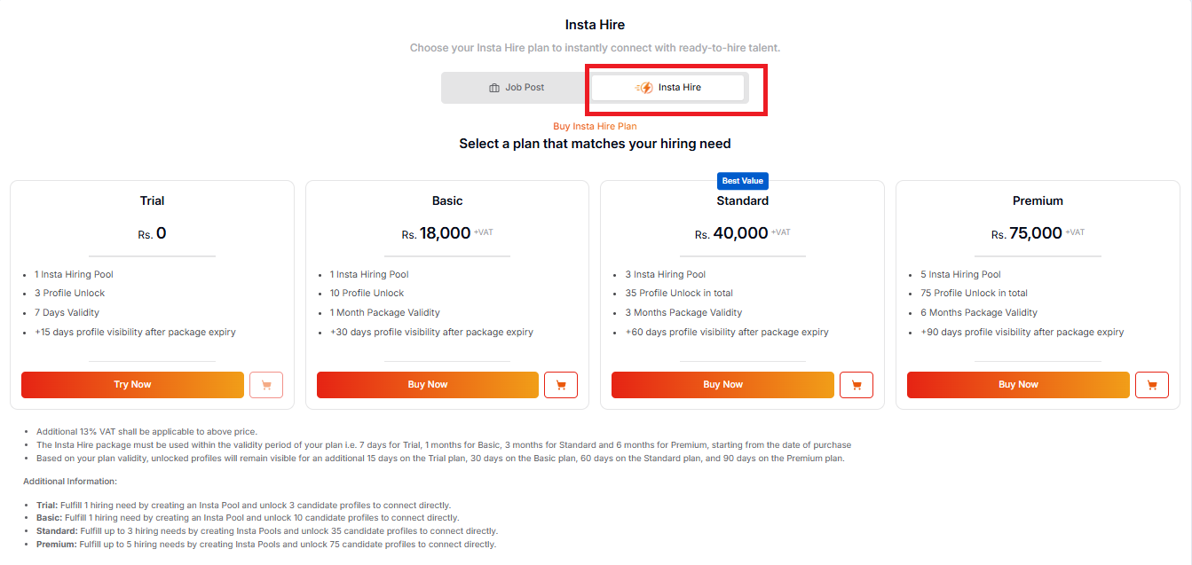 Select a plan based on your hiring requirement.