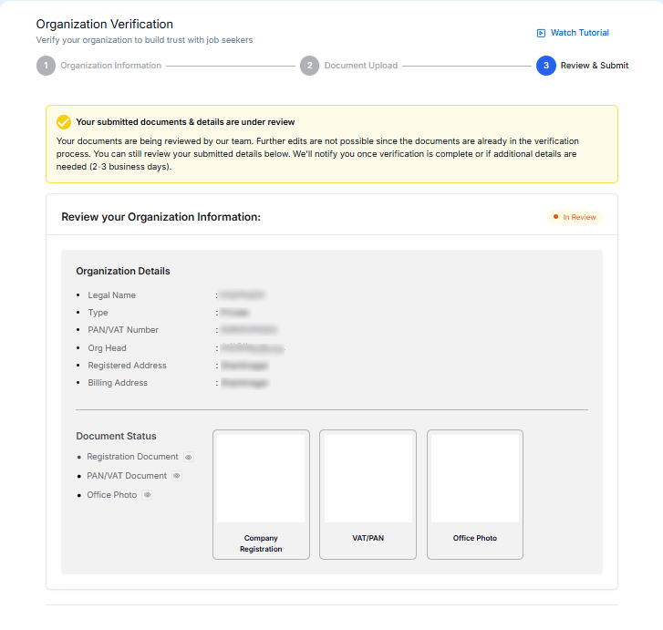 After save & Continue you redirect to this page here you see review of your organisation details if all details are accurate then press Submit for Verification button.