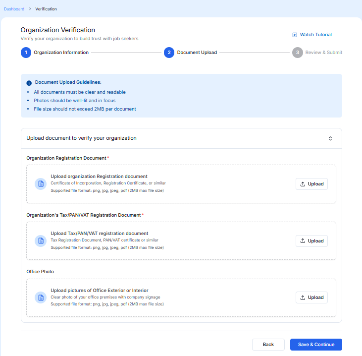After clicking the save & continue button you redirect to this page where you need to upload organisation registration documents.