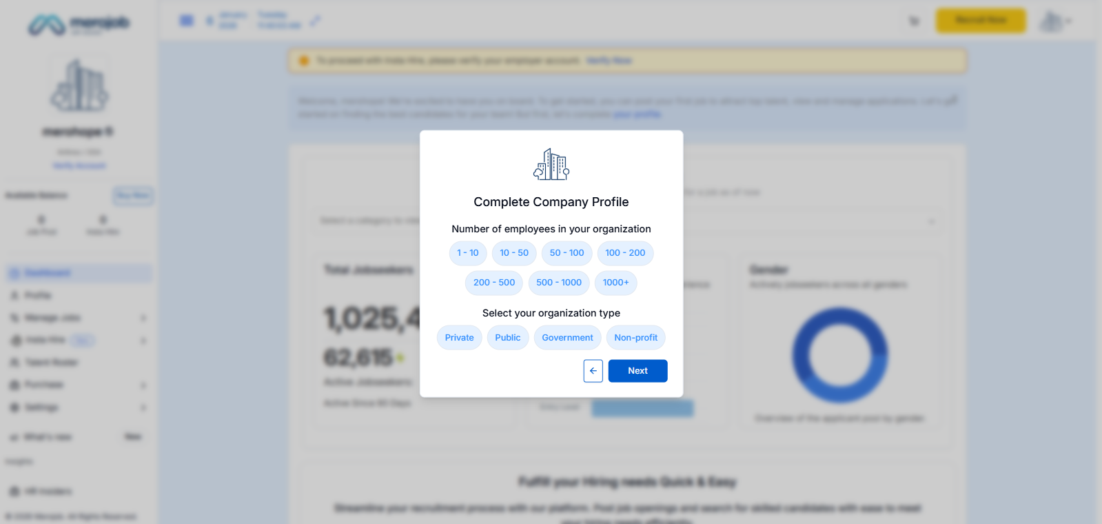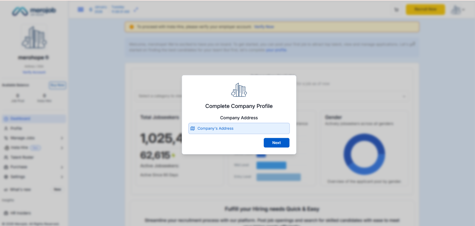 When You Click Create an Employer Account, you Redirect to this page, where you see the popup Complete Company Profile. Here you enter.