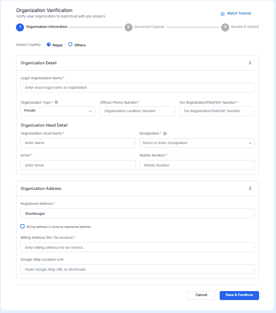 Here you can see the organization verification details form, fill all the details below and then click the save & continue button.