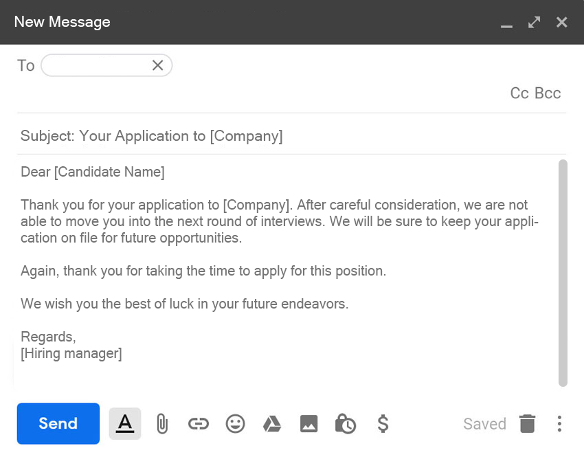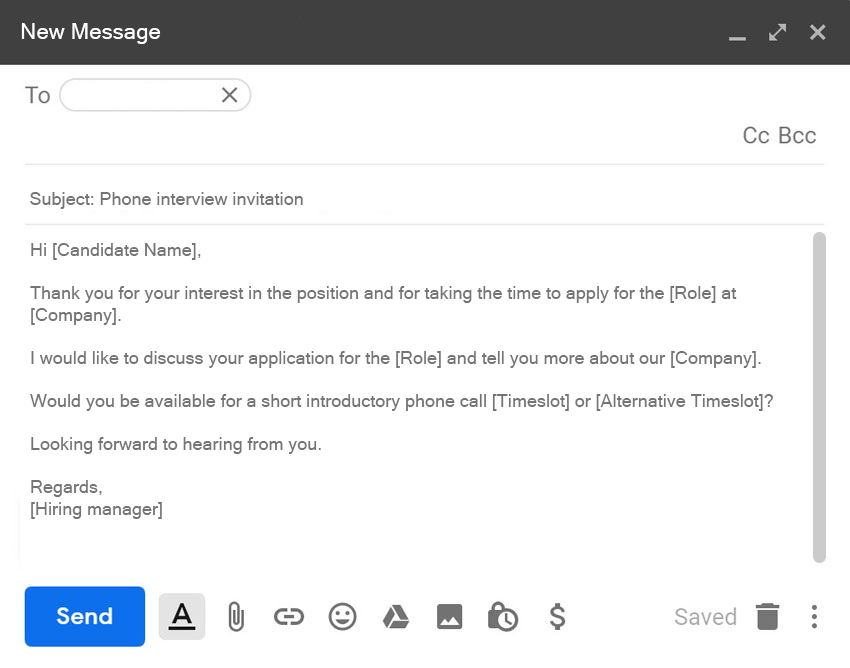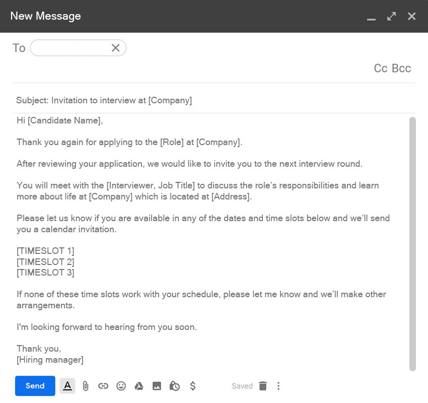 Well-crafted email templates will help reduce the workload and time to hire. A shortlisted candidate’s email should communicate two key things first, let the candidate know that you wish to proceed with their application — they’ve made it to the next round of the hiring process. Next, what it means. Is the second round a task, phone screening, or a face-to-face interview?