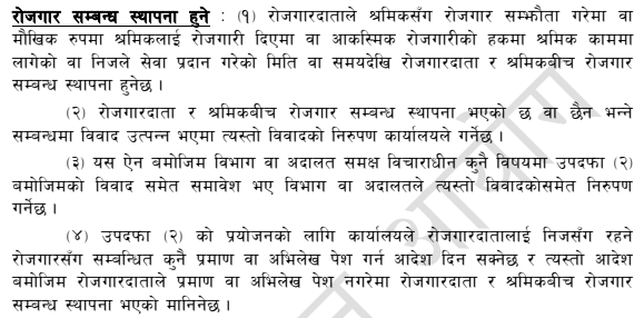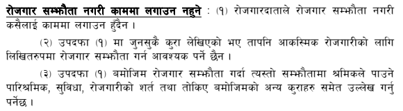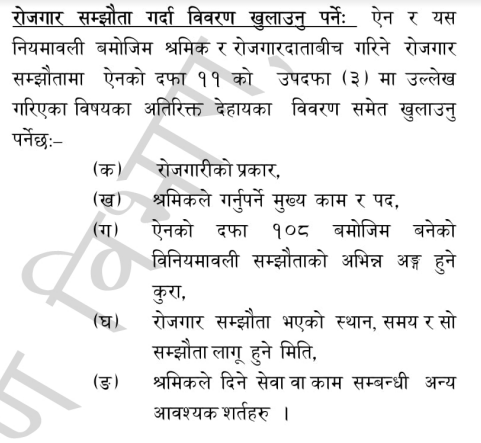 An employment agreement should clearly mention the nature of the relationship between employer and employee i.e. type of employment. As per Labor Rules, 2075 following are the type of employment: