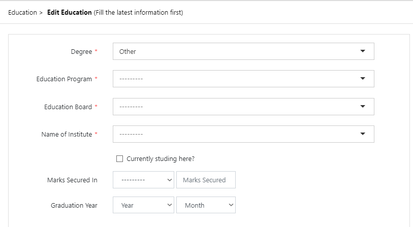 Education is also one of the main things recruiters look for on your profile. This will inform employers of your background, which can be a helpful way to understand more about your fit for the role you apply for. Don’t forget to fill in your degree, education program, board, name of institute, and marks. If you are still currently studying, check the “currently studying here” box in your latest education program.