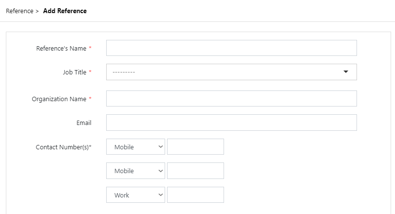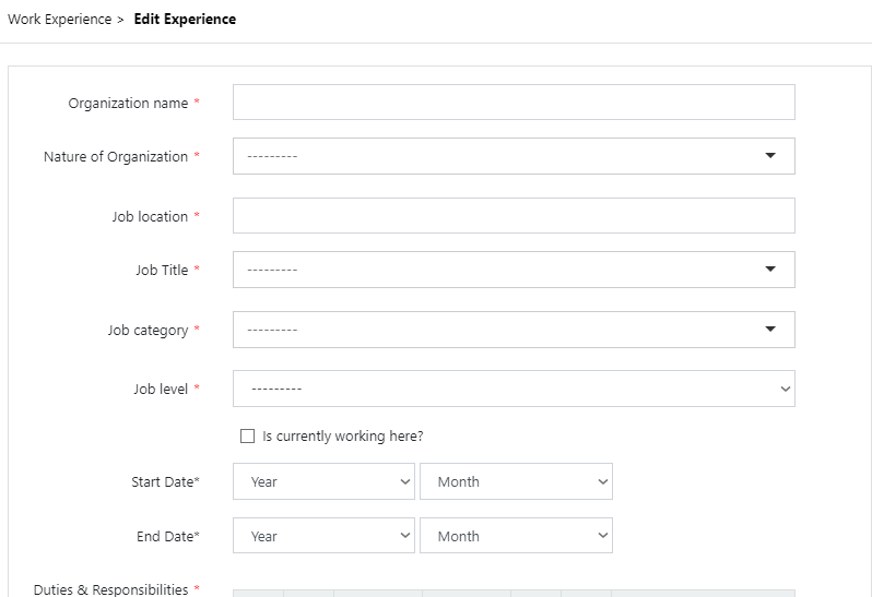 Complete your work history by adding all the companies you worked for one by one. Internships, volunteer work, freelancing, part-time and full-time work all must be included. Details to be included are organization name, nature of the organization, job locations, job title, job category, job level, duration and responsibilities.