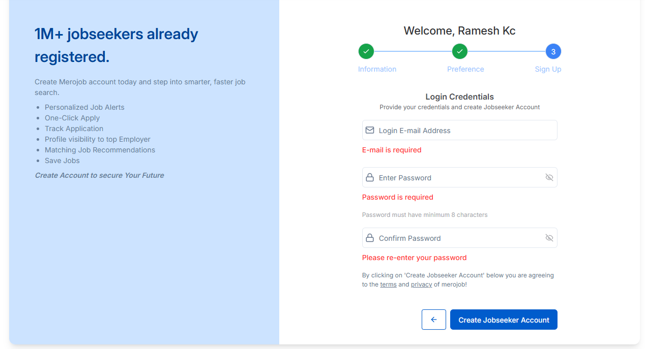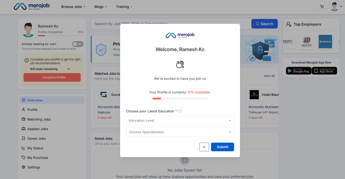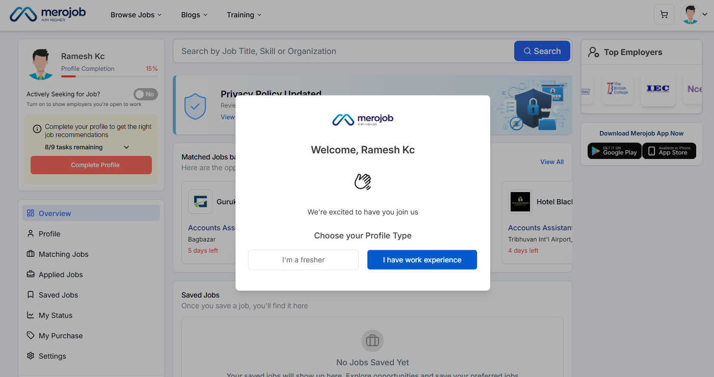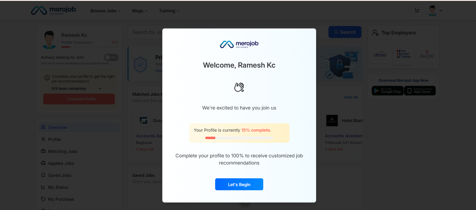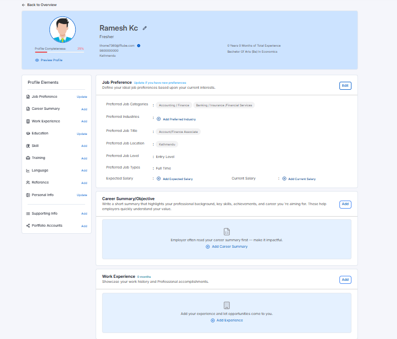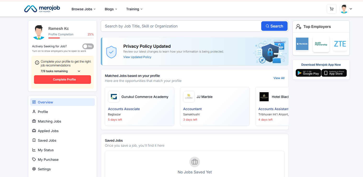 Your profile on Merojob is your online identity. It is a professional and digital image of what you are, your abilities, and what you can contribute to an organization. It is the initial contact between you and recruiters. Due to this, your profile is very important in forming your initial impression.