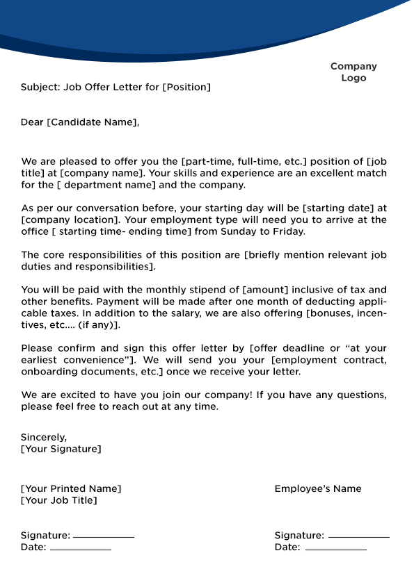 The offer letter provides information regarding the hiring package, job description and remuneration. It helps the candidates decide if the job is the right fit for them.
