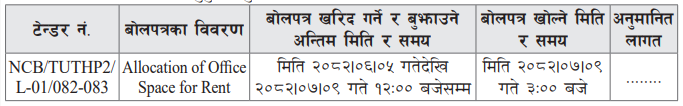 यस अस्पतालको पूर्वस्वीकृत ठाउँहरूमा Cafe र Dry Cafe सञ्चालन गर्नका लागि सिलबन्दी विद्युतीय बोलपत्र (E-Bidding) आह्वान गरिएको छ । खरिद गर्न इच्छुक इजाजत पत्र प्राप्त फर्मले हिमालयन बैंक लि., महाराजगञ्ज, काठमाडौँको चल्ती हिसाब नं. (खाता नं. ००२००५५३६५००१८) मा रकम रु.३,०००।- जम्मा गरी (फिर्ता नहुने) E-Bidding (www.bolpatra.gov.np) मार्फत खरिद गरी पेश गर्न सकिनेछ । बोलपत्र खोल्ने बैठकमा उपस्थित बोलपत्र दाता वा निजका आधिकारिक प्रतिनिधिले बोलपत्र फाराम खरिद गरेको सक्कल भौचर र सक्कल बिडबन्ड लिई आउनुहुन अनुरोध छ ।