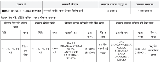 भगवतीमाई गाउँपालिका, गाउँ कार्यपालिकाको कार्यालय दैलेख यस गाउँपालिका अन्तर्गत देहायका आयोजना सञ्चालन गर्नु पर्ने भएकोले ई-विड मार्फत रितपूर्वकको शिलवन्दी बोलपत्र आह्वान गर्दछ ।