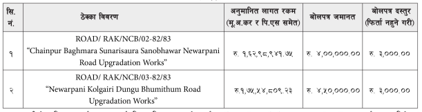 यस कार्यालयको आ.व. २०८२/०८३ को स्वीकृत कार्यक्रम अनुसार तपसिल बमोजिमको निर्माण कार्यका लागि बोलपत्र आह्वान गरिएकाले ईच्छुक बोलपत्रदाताहरुले यो सूचना प्रकाशित मितिले ३० ( तिस) दिन भित्र सार्वजनिक खरिद अनुगमनको कार्यालयको विद्युतीय प्रणाली (https://www.bolpatra.gov.np/egp/) मार्फत बोलपत्र पेश गर्नुहुन सम्बन्धित सवैको जानकारीको लागि यो सूचना प्रकाशित गरिएको छ ।