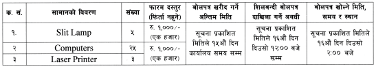 नेपाल नेत्रज्योति संघ हिमालय आँखा अस्पताल पोखराका लागि आवश्यक निम्न उपकरणहरु खरिद गर्नुपर्ने भएकोले ईच्छुक इजाजत प्राप्त आपूर्तीकर्ताहरुले शिलबन्दी बोलपत्र पेश गर्नुहुन यो सूचना प्रकाशन गरिएको छ ।