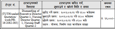 यस अस्पतालको कार्यकारी निर्देशक- १ वटा, नर्सिङ निर्देशकको आवास गृह - १ वटा, नर्सिङ स्टाफ बस्ने आवास गृह- २ वटा भत्काउन न्यूनतम मूल्याङ्कित दररेटमा बढाबढ दररेट पेश गर्ने गरी दरभाउपत्र आह्वान गरिएको छ । दरभाउपत्र खरिद गर्न इच्छुक इजाजत पत्र प्राप्त फर्मले आवश्यक कागजात सहित हिमालयन बैंक लि., महाराजगञ्ज, काठमाडौँको चल्ती हिसाब खाता नं. ००२००५५३६५००१८ मा रु. १,०००।०० (एक हजार मात्र) को रकम जम्मा गरी (फिर्ता नहुने गरी) यस अस्पतालको योजना, निर्माण तथा कार्यक्रम शाखाबाट दरभाउपत्र फाराम खरिद गरी पेश गर्न सकिनेछ । दरभाउपत्र खोल्ने बैठकमा उपस्थित दरभाउपत्र दाता वा निजका आधिकारिक प्रतिनिधिले दरभाउपत्र फाराम खरिद गरेको सक्कल भौचर र बिडबन्ड लिई आउनुहुन अनुरोध छ । साथै, छनोटमा पर्ने दरभाउपत्र दाताहरूले सम्झौता गर्दा निजले कबोल गरेको रकम यस अस्पतालको हिमालयन बैंक लि., महाराजगञ्ज, काठमाडौँमा रहेको चल्तो हिसाब खाता नं. ००२००५५३६५००१८ मा जम्मा गरो सम्झौता गर्नुपर्नेछ ।