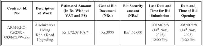 यस गाउँपालिकाद्वारा तपसिल अनुसारको निर्माण कार्य राष्ट्रिय स्तरको खुल्ला विद्युतीय बोलपत्र खरिद प्रक्रियाको माध्यमबाट मात्र खरिद गर्नुपर्ने भएकोले नेपाल सरकारबाट इजाजत प्राप्त इच्छुक योग्य नेपाली बोलपत्रदाताहरुका लागि बोलपत्र कागजातमा उल्लेखित शर्तहरूको अधिनमा रही रितपूर्वकको बोलपत्र आह्वान गरिन्छ । यस सम्बन्धी सम्पूर्ण कुराहरू बुझ्नको लागि यस कार्यालयको वेबसाईट https://www.aiselukharkamun.gov.np सार्वजनिक खरिद अनुगमन कार्यालयको वेबसाईट https://www.bolpatra.gov.np/egp वा यस कार्यालयको सूचनापाटी तथा कार्यालय समयमा कार्यालयको प्राविधिक शाखामा सम्पर्क गर्न सकिनेछ ।