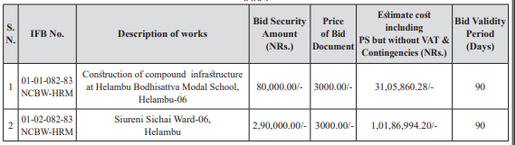 यस हेलम्बु गाउँपालिकाको आ. व. २०८२/८३ को स्वीकृत कार्यक्रम वमोजिम निम्न उल्लेखित कार्यहरु बोलपत्रको माध्यमबाट गराउन पर्ने भएको हुदाँ तपसिलमा उल्लेख भएको ठेक्काहरुको लागि ईजाजत प्राप्त निर्माण व्यवसायीहरुले यो सूचना प्रकाशित भएको मितिले ३१ औं दिन २०८२/०७/२८ को दिनको १२:०० बजे भित्र सार्वजनिक खरिद अनुगमन कार्यालयको वेवसाईट www.bolpatra.gov.np/egp बाट Online bidding गर्न सम्बन्धित सबै को जानकारीका लागी यो सूचना प्रकाशित गरिएको छ।