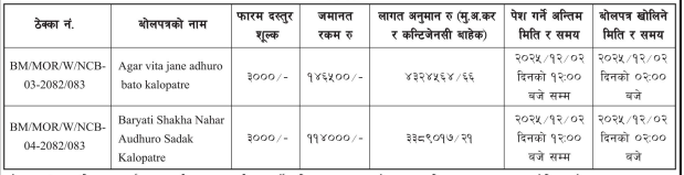 २) २०८३/०२/३१ गते सम्म कार्य सम्पन्न गर्न सक्ने इजाजतप्राप्त व्यवसायीले मात्र बोलपत्र पेस गर्नुहुन ।