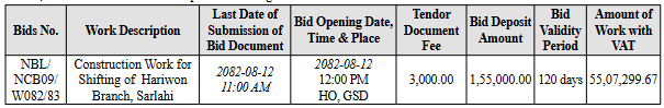Nepal Bank Limited invites electronic bids from eligible bidders for Civil, Electrical & Networking Work for Shifting of Hariwon Branch, Sarlahi under National Competitive Bidding.