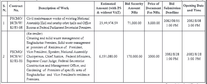 Federal Secretariat Construction and Management Office Invites electronic bid only form eligible bidders for the procurement of the following works under NCB procedure as per Public Procurement Act 2063, Clause 66. For further information, visit e-GP portal of PPMO www.bolpatra.gov.np/egp.