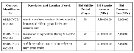 1. Rajdevi Municipality invites electronic bids from Nepalese eligible bidders for the following work in Rajdevi Municipality, Rautahat under National Competitive Bidding-Single Stage Two Envelope Bidding procedures.