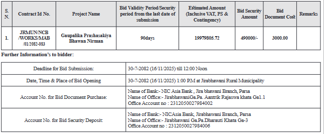 2. Eligible Bidders may obtain further information and inspect the bids Documents at the Jirabhawani Rural Municipality Office, Parsa or may visit PPMO website www.bolpatra.gov.np/egp