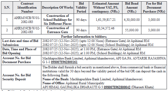 1. Apihimal Rural Municipality, Office of the Rural Municipal Executive, Darchula, invites e-bid for eligible bidders for the following works: