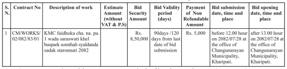 1. Changunarayan Municipality, office of the Municipal Executive, Kharipati, and Bhaktapur invites electronic bids from Nepalese eligible bidders under National Competitive Bidding procedures. Bidding is open to all eligible Nepalese Bidders.