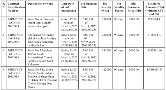 1. Shivapuri Rural Municipality, Office of the Rural Municipal Executive,Sherabagar Nuwakot invites electronic bids from eligible bidders for the procurements of works as per table below under National Competitive Bidding procedures. Only eligible bidders should participate in this bidding.