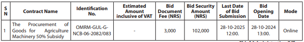 2. A complete set of Bidding Documents may be purchased from the office Malika Rural Municipality Arkhawang, Gulmi by eligible Bidders on the submission of a written application, along with the copy of company/firm registration certificate, and upon payment of a non- refundable fee as specified below till the respective dates. Electronic Bidding Document is available online and can be downloaded from PPMO's website http://www.bolpatra.gov.np/egp, The Bidders have to download the necessary part of bidding documents, prepare their bid and submit electronic bids as specified in the Instructions to Bidders. The Bidder shall be required to deposit the non-refundable fee as specified below and electronic scanned copy (pdf format).