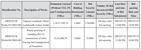 Note: For further details downloading tendar documents, please visit PPMO website www.bolpatra.gov.np or www.mahabumun.gov.np and contact 9858074608, 9868292357 or [email protected].
