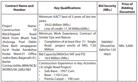 1. Baijanath Rural Municipality Office of Rural Executive, Rampur, Banke invites electronic bids from eligible bidders for the following bid under National Competitive Bidding- Single Stage- Two Envelope Bidding Procedures. Only eligible bidders should participate in the bidding for the contracts as in the table below. The bid validity period is 90 days from the date of last date of bid submission.