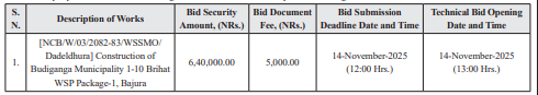 1. Water Supply and Sewerage Management Office, Dadeldhura invites bids from Eligible and qualified bidders through "Single Stage Two Envelope' procedure for the following works under National Competitive Bidding Procedures.