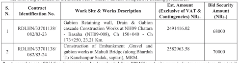 1. Road Division Lahan invites Open Competitive Bidding (Single Stage Single/Double IFB) from eligible bidders for the following contracts as mentioned below under National Competitive Bidding procedures: