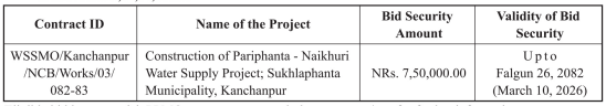1. The Water Supply and Sewerage Management Office, Kanchanpur invites the electronic bids from all the eligible bidders for the procurement of the following works under National Competitive Bidding - Single Stage Two Envelope Bidding procedures.
