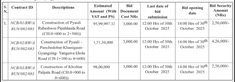 1. Arun Rural Municipality, Bhojpur, Koshi Pradesh. Nepal, invites electronic bids only from Nepalese eligible bidders for the following works under National Competitive Bidding (NCB) procedures.