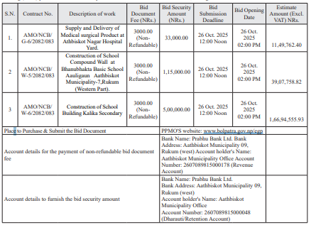 1. Aathbiskot Municipality Office invites electronic bids from eligible bidders for the following work under National competitive Bidding (NCB) procedure. Some of the qualification criteria are mentioned below, through the details are: