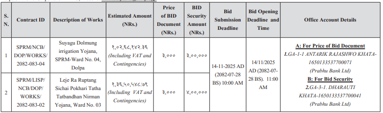 1. Shey-Phoksundo Rural municipality invites electronic bids from the eligible bidders for construction of the following works under National Competitive Bidding (NCB) Bidding procedure.