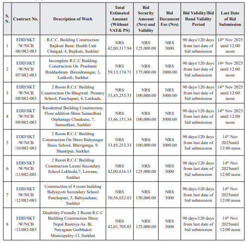 1. EDD, Surkhet invites following electronic bid from eligible Nepalese Bidders under National Competitive Bidding.