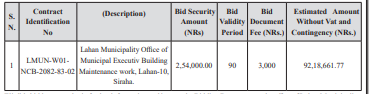 3. Interested bidders should submit electronic bids through PPMO's e-GP system www.bolpatra.gov.np/egp only on or before 13-11-2025 A.D. 12:00 noon. Bidders are required to follow the electronic bid submission procedure as specified in e-GP System Operating Guideline, 2080 and User manuals issued by PPMO which are available in e-GP system. Bids received after this deadline will be rejected. The bids will be opened in the presence of Bidders' representatives who choose to attend on 13-11-2025 A.D. 2:00 PM at the office of Lahan Municipality, Lahan. Bids must be valid for a period of days as mentioned in the table above after bid opening and must be accompanied by a bid security, amounting to a minimum as mentioned in the table above which shall be valid for 30 days beyond the validity period of the bid. The scanned copy of the bid security in pdf format should be uploaded in the e-GP system during bid submission