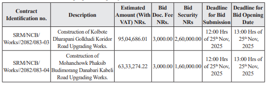 1. Sangurigadhi Rural Municipality, Bhedetar, Dhankuta, invites online Bids from Nepalese eligible bidders for the following works under National Competitive Bidding (NCB) Single Stage Single Envelope System Bidding Procedure. Bidders may obtain further information from the PPMO web Portal website: www.bolpatra.gov.np/egp with Public Entity Name: Sangurigadhi Rural Municipality, Office of the Rural Municipal Executive, Bhedetar, Dhankuta. www.sangurigadhimun.gov.np