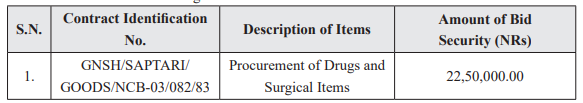 1. The Gajendra Narayan Singh Hospital, Rajbiraj, Saptari, Nepal invites electronic bids from eligible bidders for the procurement Supply, Delivery Medicine & Surgical Item as specified in Public Procurement Act and Regulation.