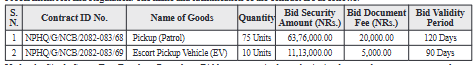 2 NPHQ GNCB/2082-083/69 Escort Pickup Vehicle (EV) 90 Days 2. Under the Single Stage, Two Envelope Procedure, Bidders are required to submit simultaneously two separate envelopes, one containing "The Technical Bid" and the other "The Price Bid", as per the provision of ITB 23 of the Bidding Document.