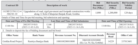 1. Gorkha Road Project, Gorkha, invites open competitive electronic bids from duly eligible national bidders for the following works under National Competitive Bidding-Single Stage Two Envelope Bidding procedures.