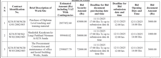 5. Bids Must be submitted to the above office the Karnali Technical School, jumla on or before the specified date and time as shown in table below. Documents received after thus deadline shall not be accepted.