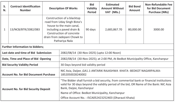 1. Bedkot Municipality, Office of Municipal Executive, Kanchanpur invites E-bid for Tender for the following works: