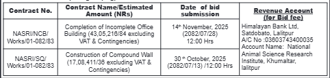 The National Animal Science Research Institute, Khumaltar, Lalitpur invites electronic Bid/Quotation from Nepalese eligible bidders for the construction works given table below. Bidders may obtain further information at the office of the National Animal Science Research Institute, Khumaltar, Lalitpur, Phone No: 977-01-5524040/5549300 or may visit PPMO website www.bolpatra.gov.np/egp.